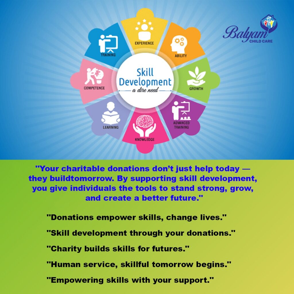 "Donations empower skills, change lives." "Skill development through your donations." "Charity builds skills for futures." "Human service, skillful tomorrow begins." "Empowering skills with your support."